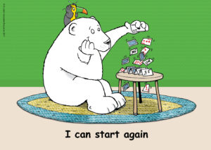 Can you find the toucan in every card? The toucan observes the action from the sidelines or from the air or even from the other side of the window. The toucan’s expressions and behaviour are responsive to what is happening in each picture. The toucan is an ‘observer character’—a witness—and he or she has an important job. The toucan watches what is going on and represents an extra voice or alternative viewpoint that can be brought into the conversation. It is a voice that has a more detached perspective than the characters participating directly in the scene. You can ask: